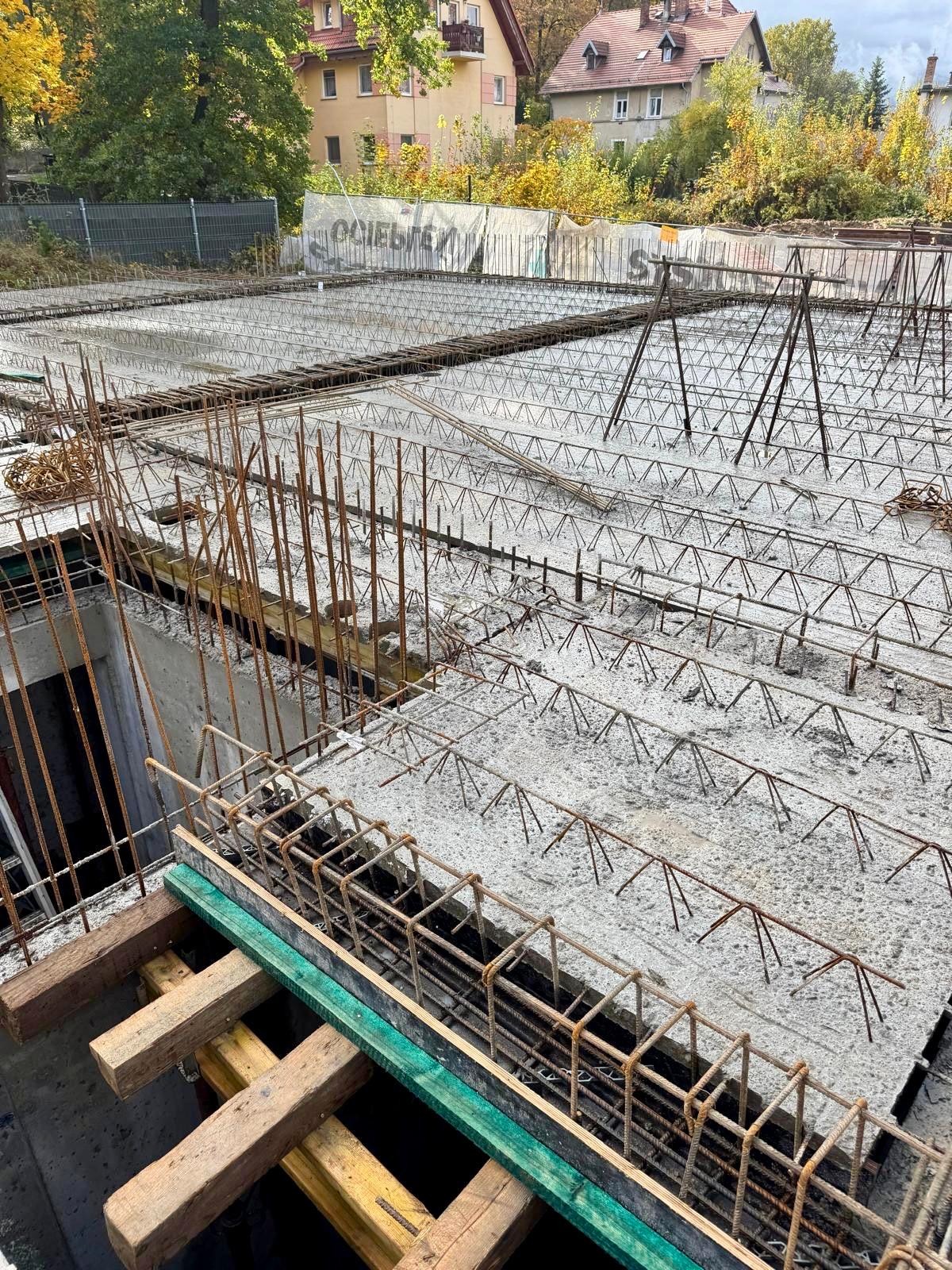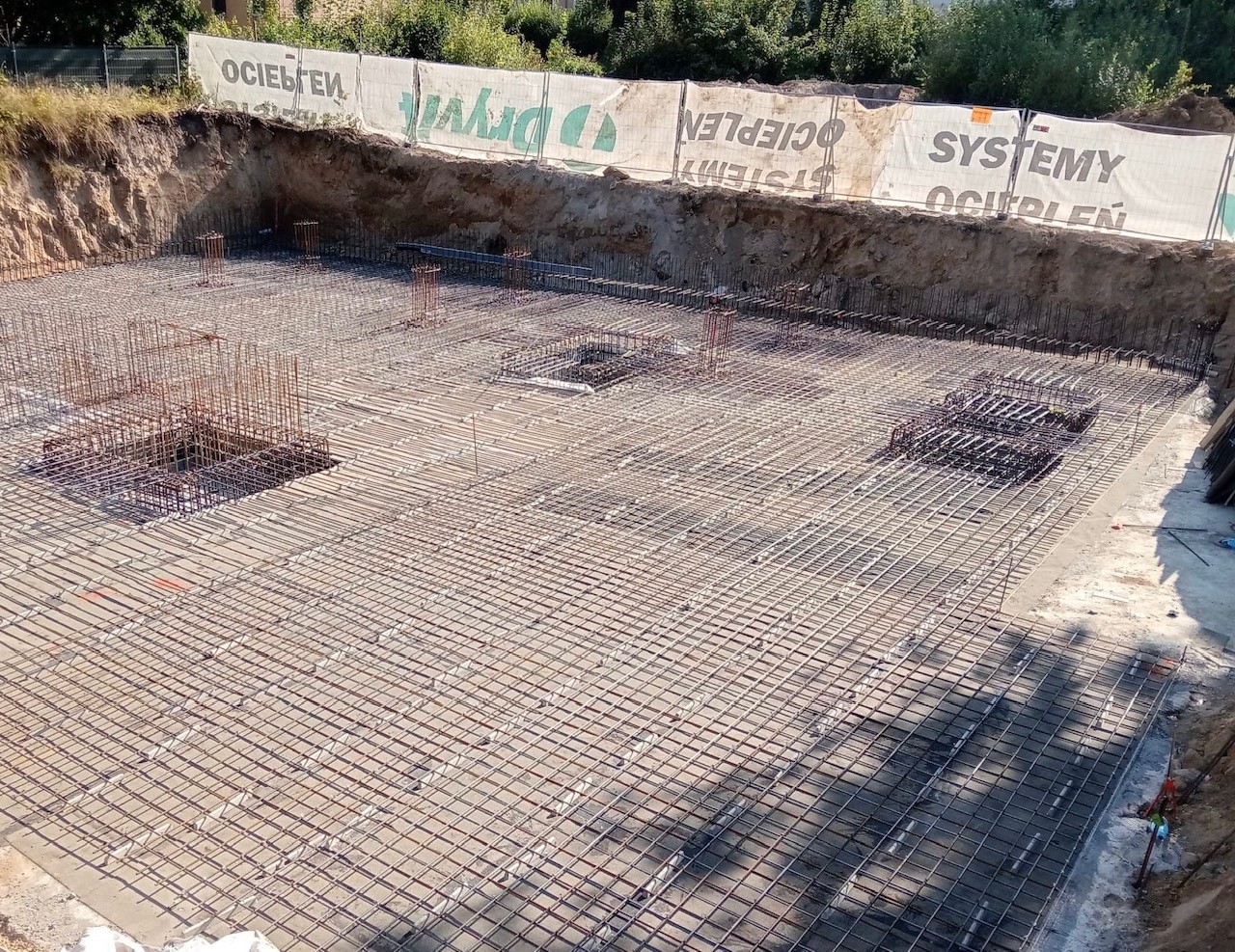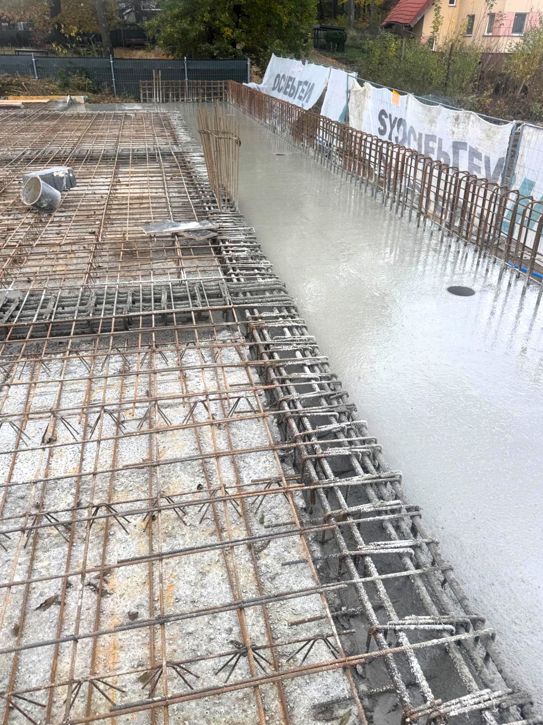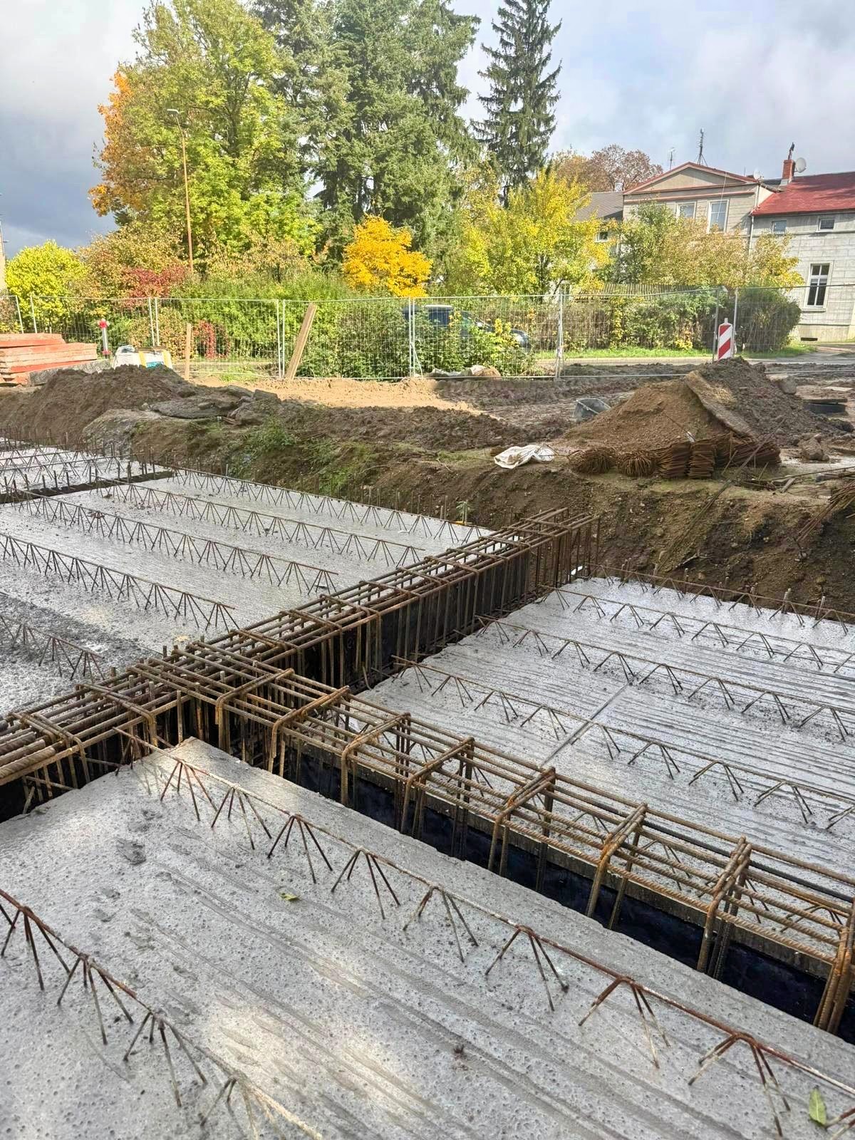 Postęp prac budowlanych Wrzesień 2025 – płyta fundamentowa hali garażowej – ściany hali garażowej Październik 2025 – strop nad halą garażową – izolacja ścian kondygnacji „-1” – ściany nośne kondygnacji „0”