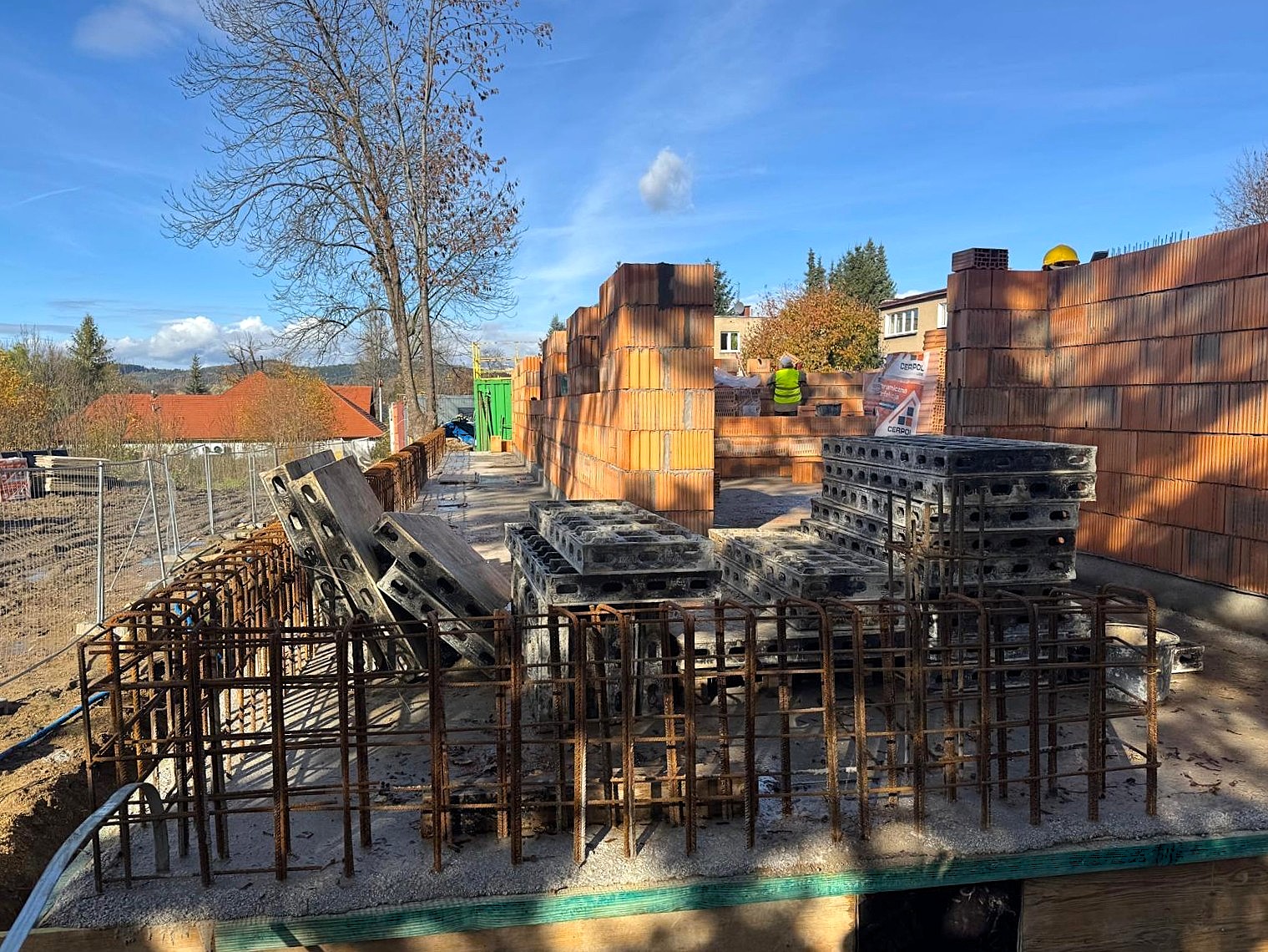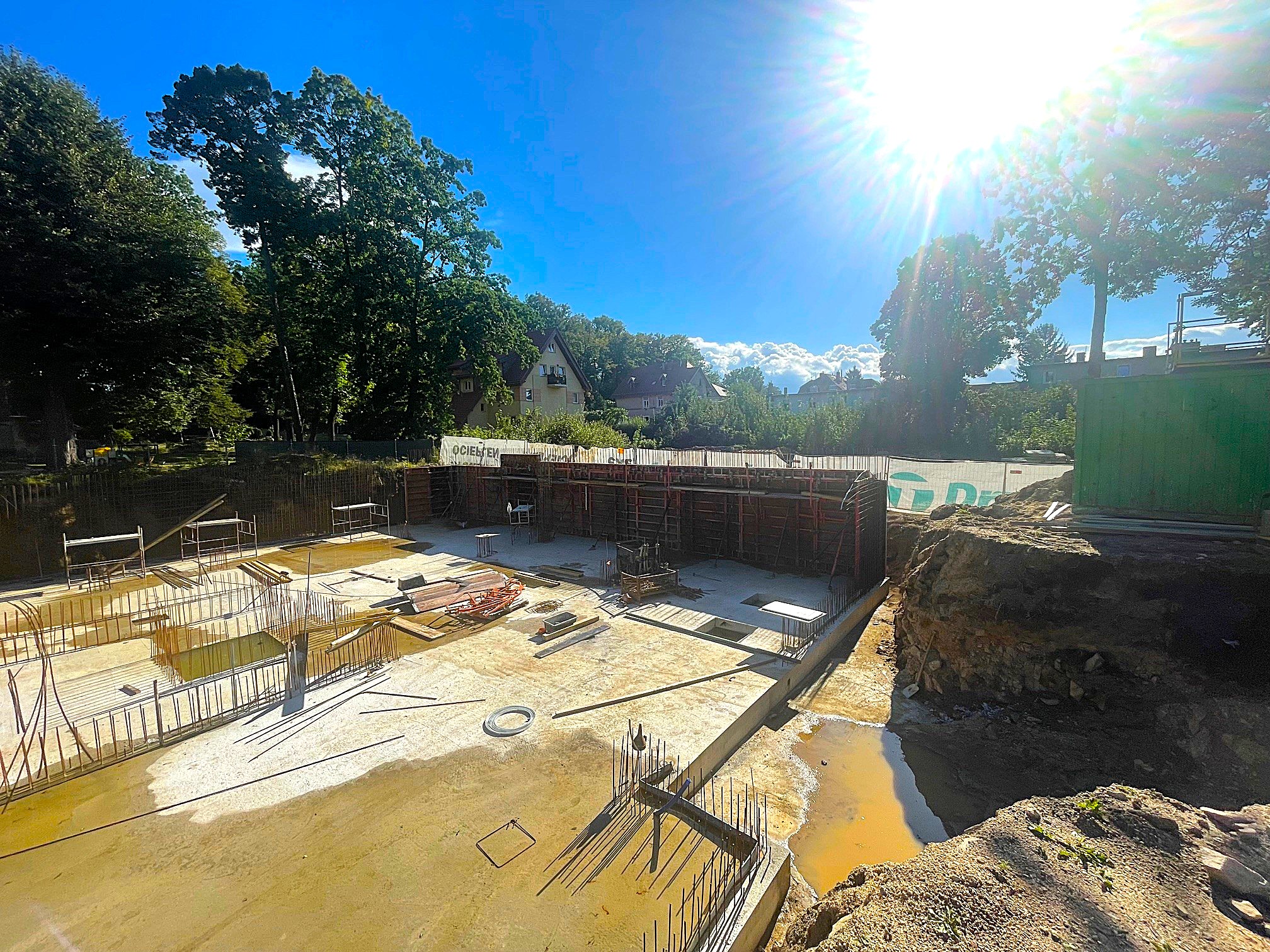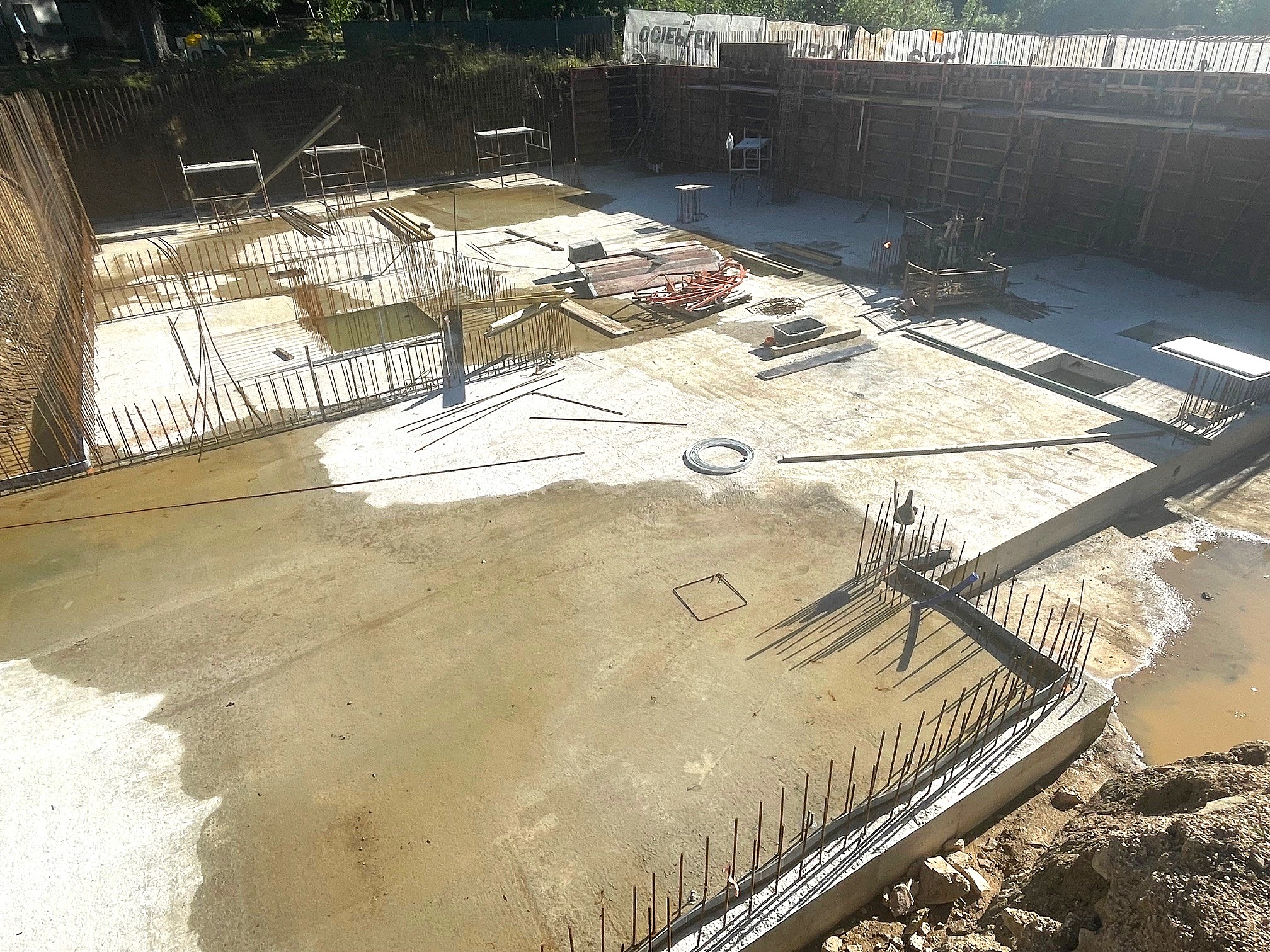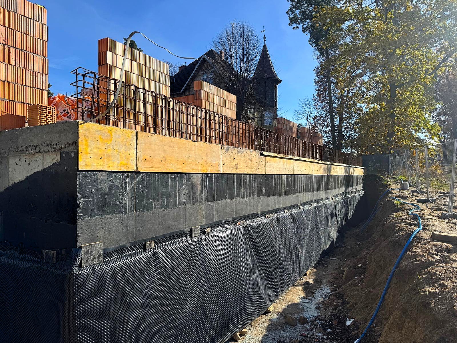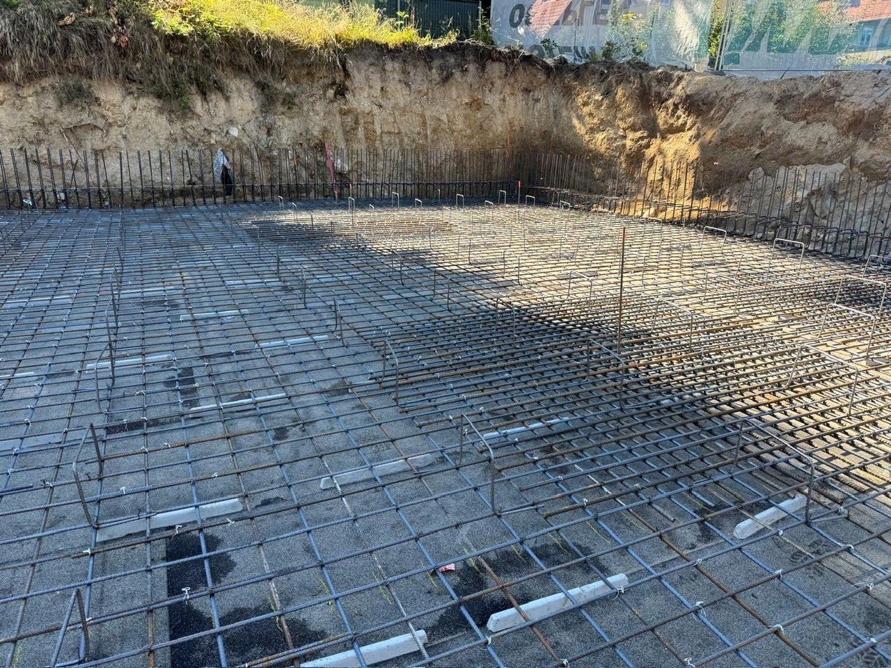 Postęp prac budowlanych Wrzesień 2025 – płyta fundamentowa hali garażowej – ściany hali garażowej Październik 2025 – strop nad halą garażową – izolacja ścian kondygnacji „-1” – ściany nośne kondygnacji „0”