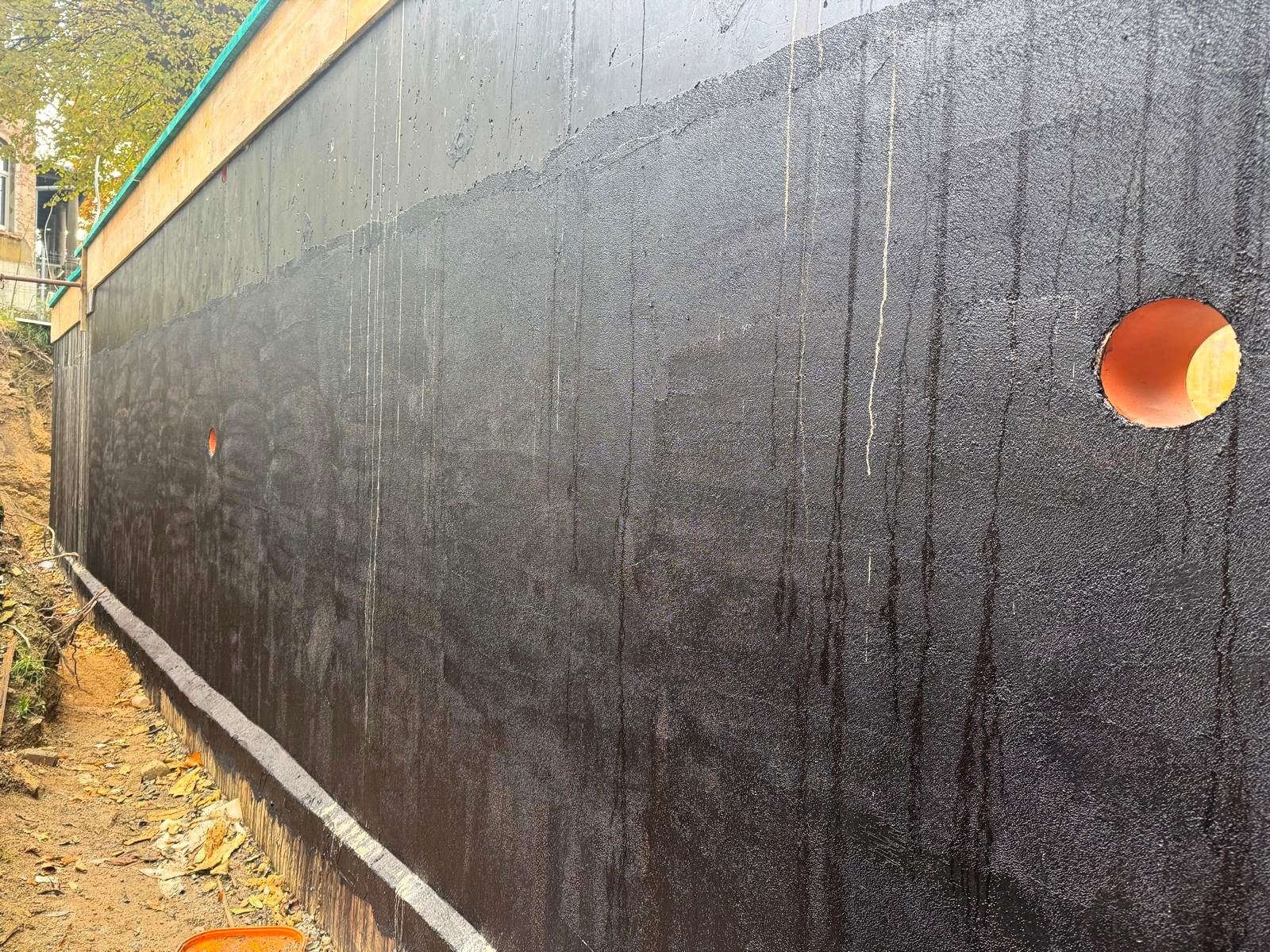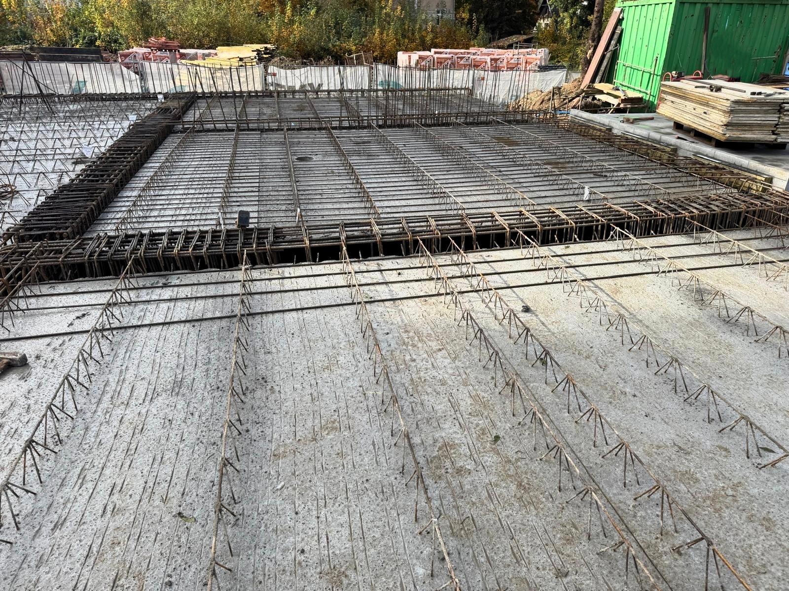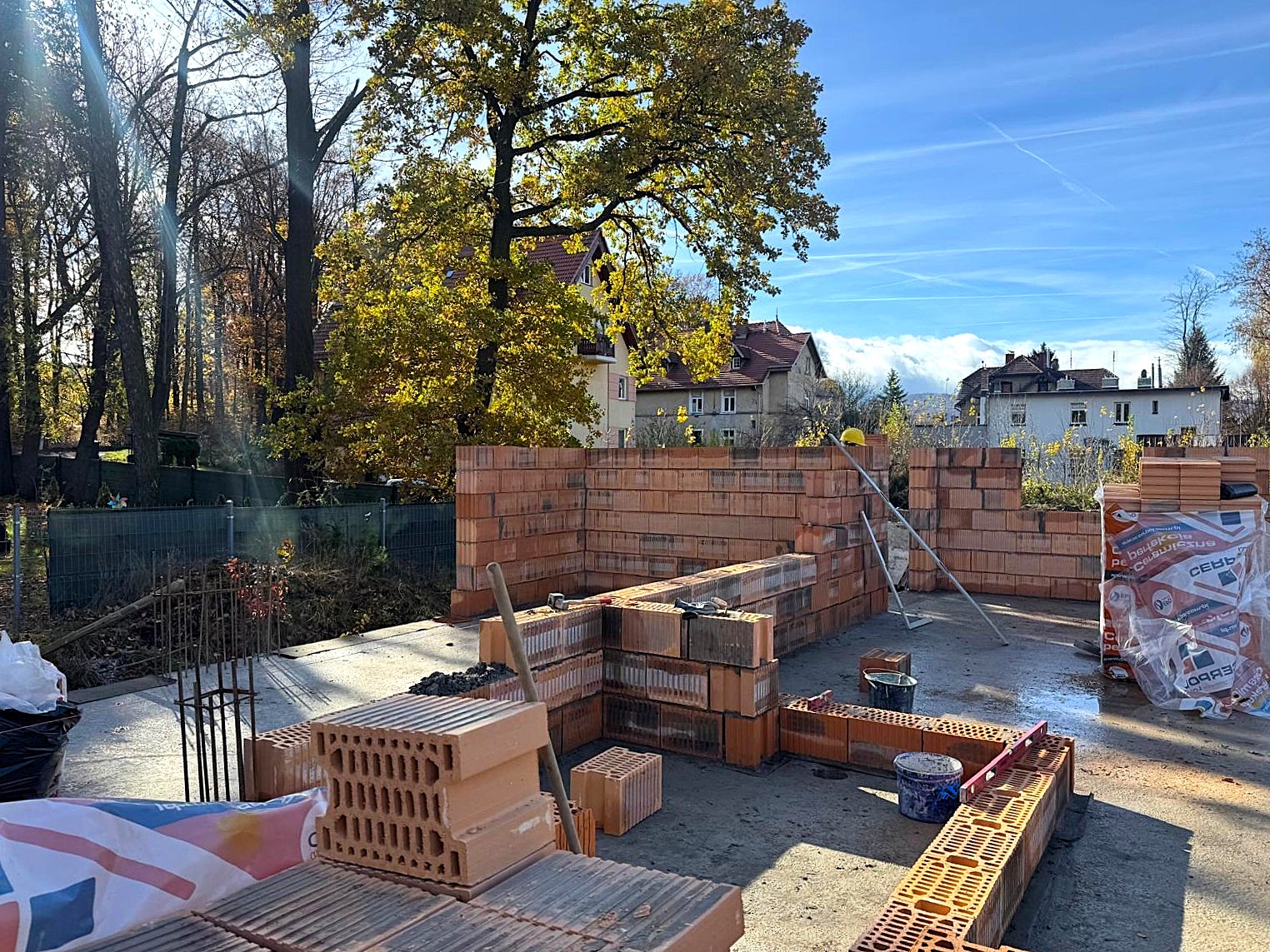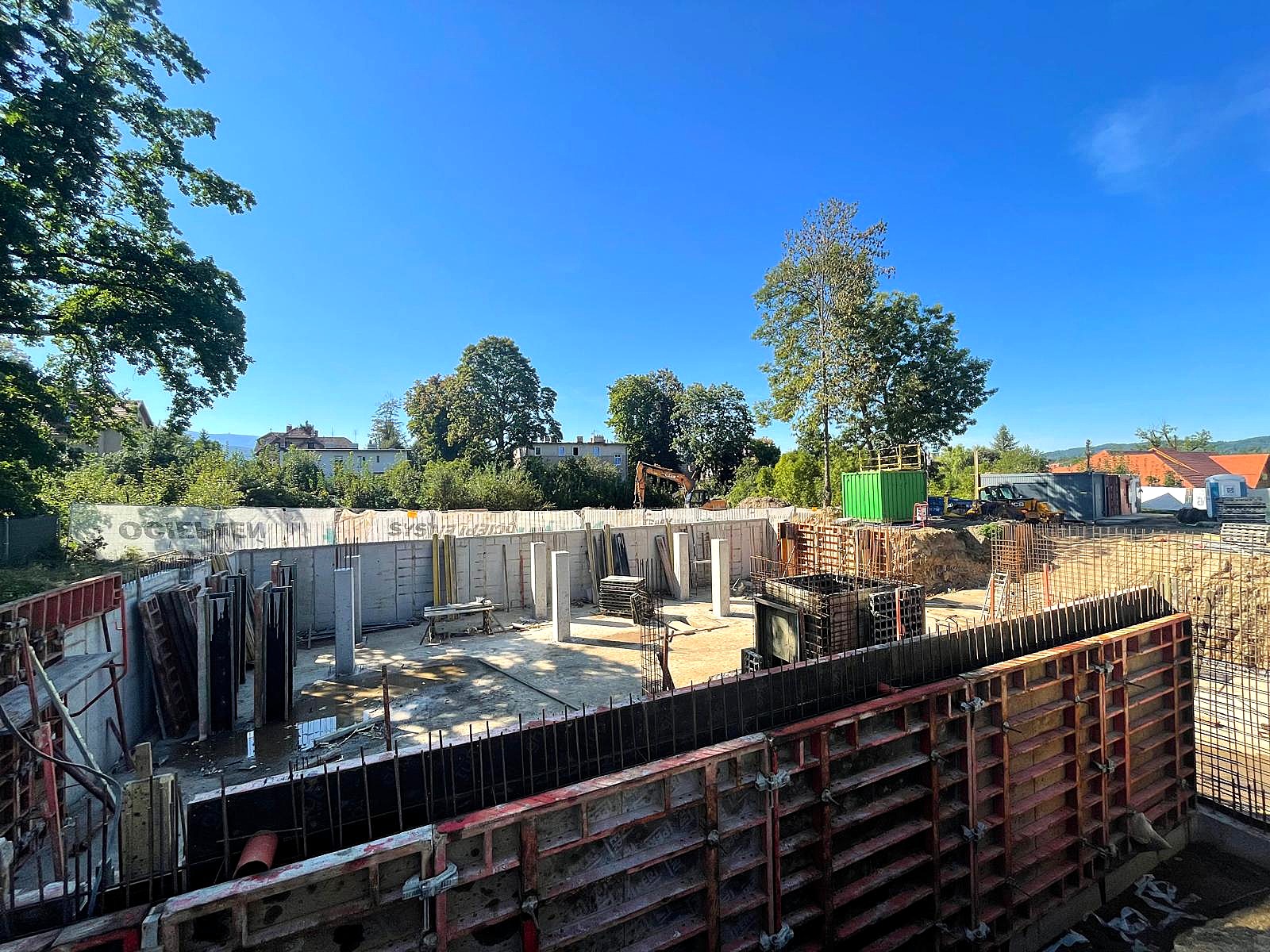 Postęp prac budowlanych Wrzesień 2025 – płyta fundamentowa hali garażowej – ściany hali garażowej Październik 2025 – strop nad halą garażową – izolacja ścian kondygnacji „-1” – ściany nośne kondygnacji „0”